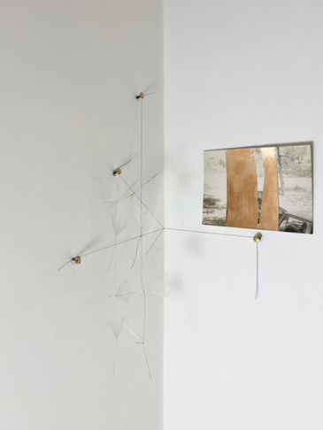 Foto d'archivio, rame, semi di tarassaco annodati, collage.