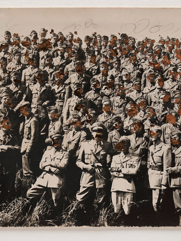 I therefore decided to imitate his gesture by covering the originals from that archive in copper leaf, deconstructing stereotypes, like those in a family album, and selecting one piece, or several, to create a narrative repositioning.